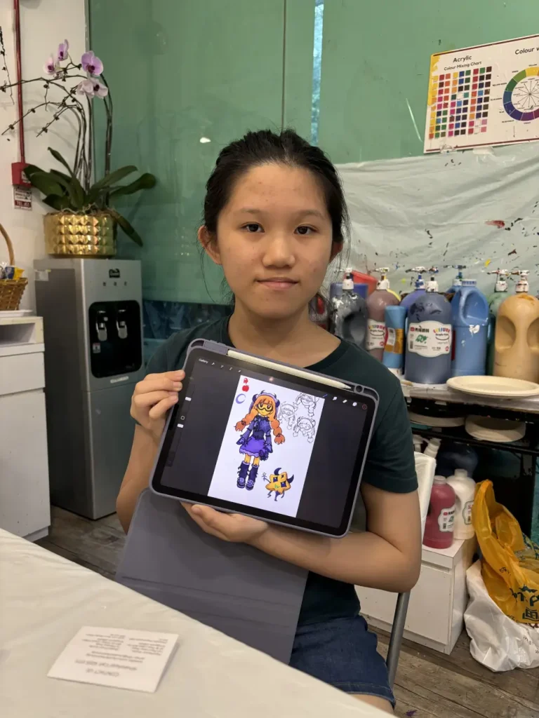 • Traditional Drawing × AI Assistance: Students begin with hand-drawn character line art, then use AI tools for colouring and background generation—solving common challenges such as “colouring difficulty” and “plain backgrounds.”