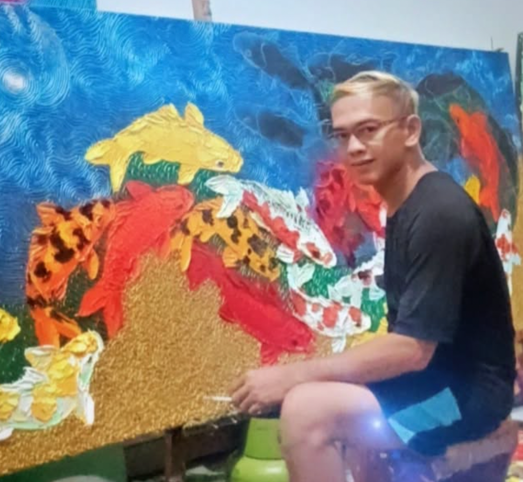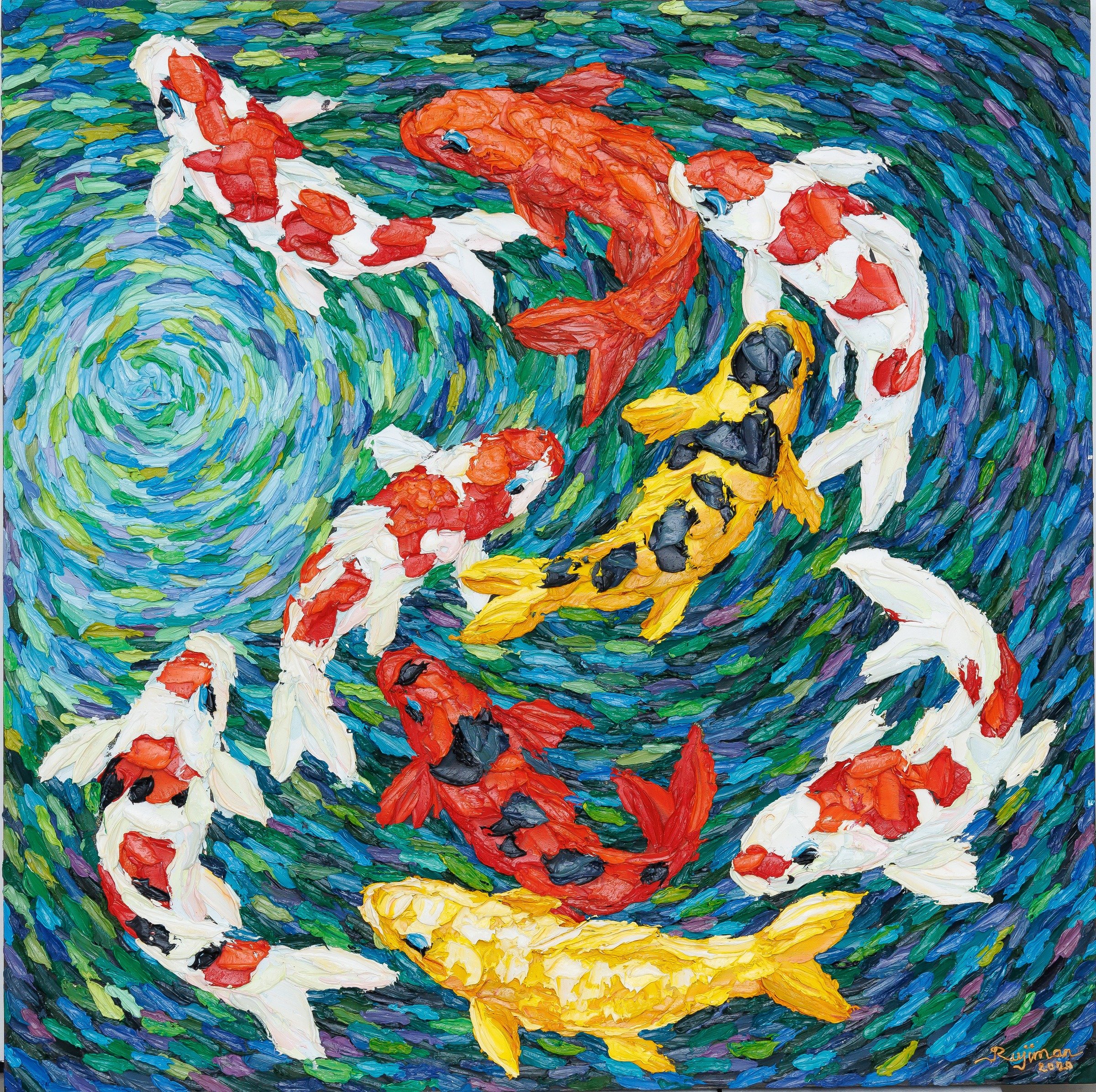Rujiman was born in 1975 and graduated from the School of Fine Arts in Yogyakarta. He currently stays in Indonesia. Known as the ‘Koi Fish painter’, Rujiman’s abstract oil paintings are heavily impasto-ed, which adds great energy to his subject matter. He transfers the movements, color schemes and implications of Koi fish from his memory onto canvas using a pallet knife, and captures a style that spans abstract to semi-abstract to Impressionism. The artist has shown much cultural achievement as a fish painter and is skilled in connecting aesthetics with Asian philosophy. He is highly recognized in Indonesia and is rapidly gaining popularity for his style.