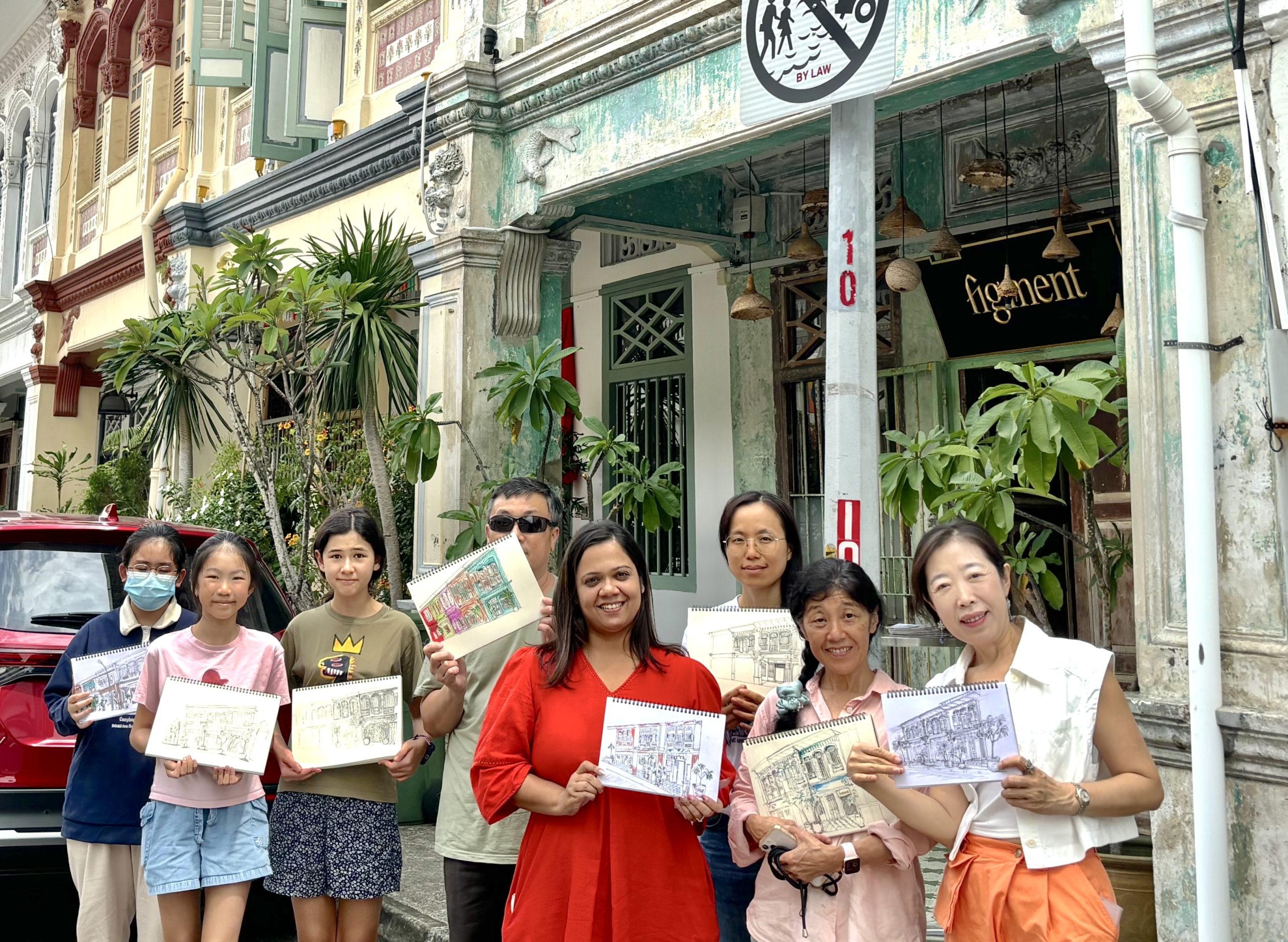 与国际学生一起进行新加坡牛车水店屋户外风景写生