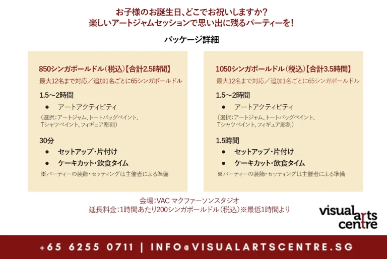 小さなお子様の誕生日をユニークでクリエイティブな方法でお祝いしたいとお考えですか?お子様の特別な誕生日を忘れられないものにしたいですか?ビジュアル・アート・センターでは、お子様のために、芸術的で楽しいアートを取り入れたお誕生日会アート・ジャム・セッションを開催いたします!フレンドリーなファシリテーターの指導のもと、素敵なアート作品を作りながら、手を動かして一日を過ごしましょう!ニーズに合わせてカスタマイズ可能なビジュアルアーツセンターは、お子様の夢のアートな誕生日パーティーアートジャミングを計画するお手伝いをいたします!