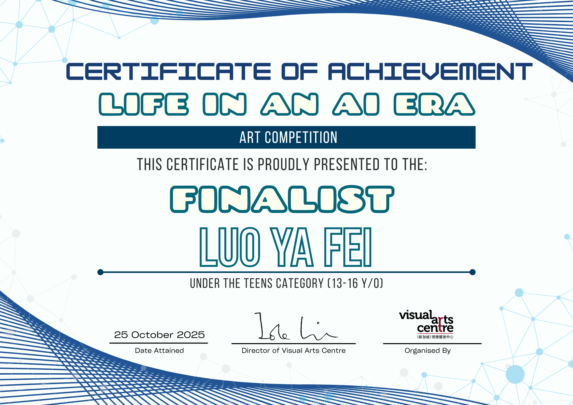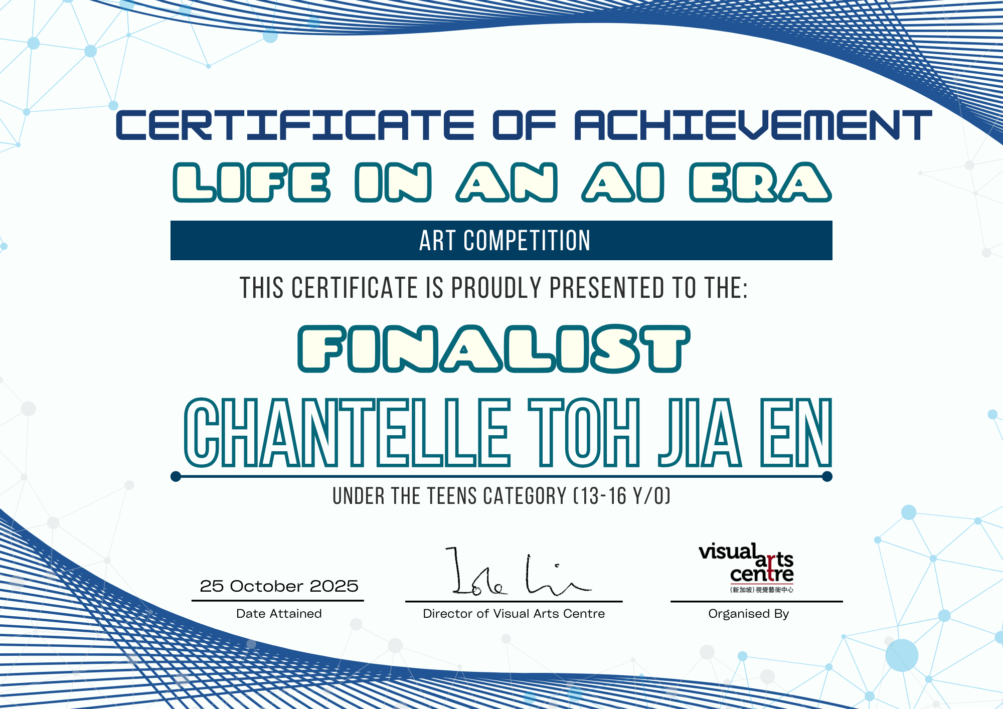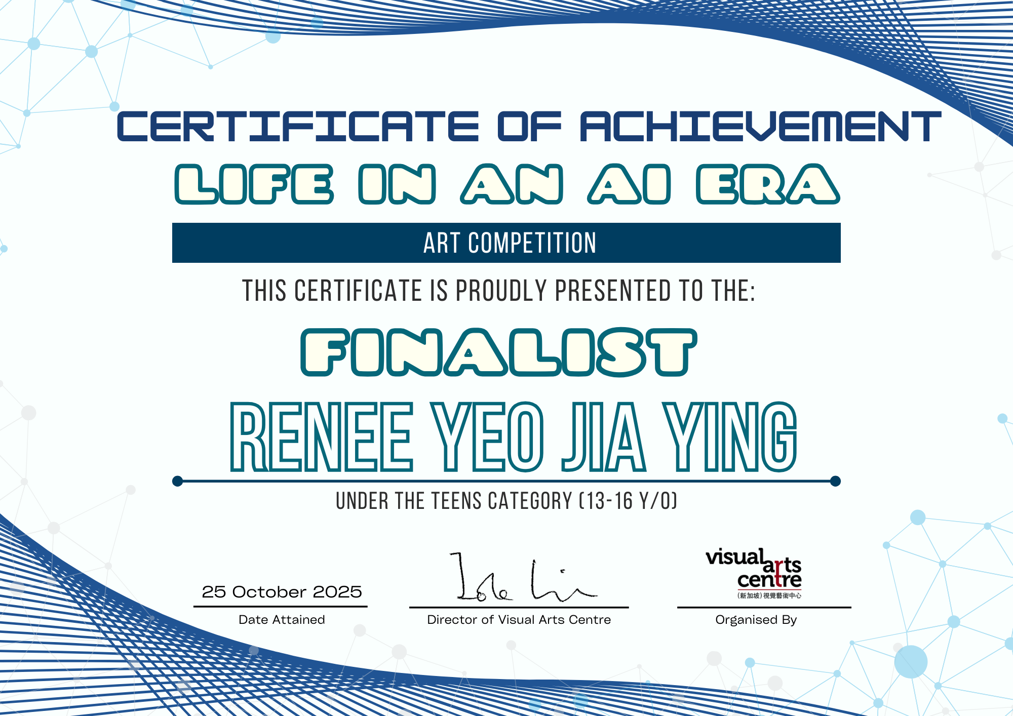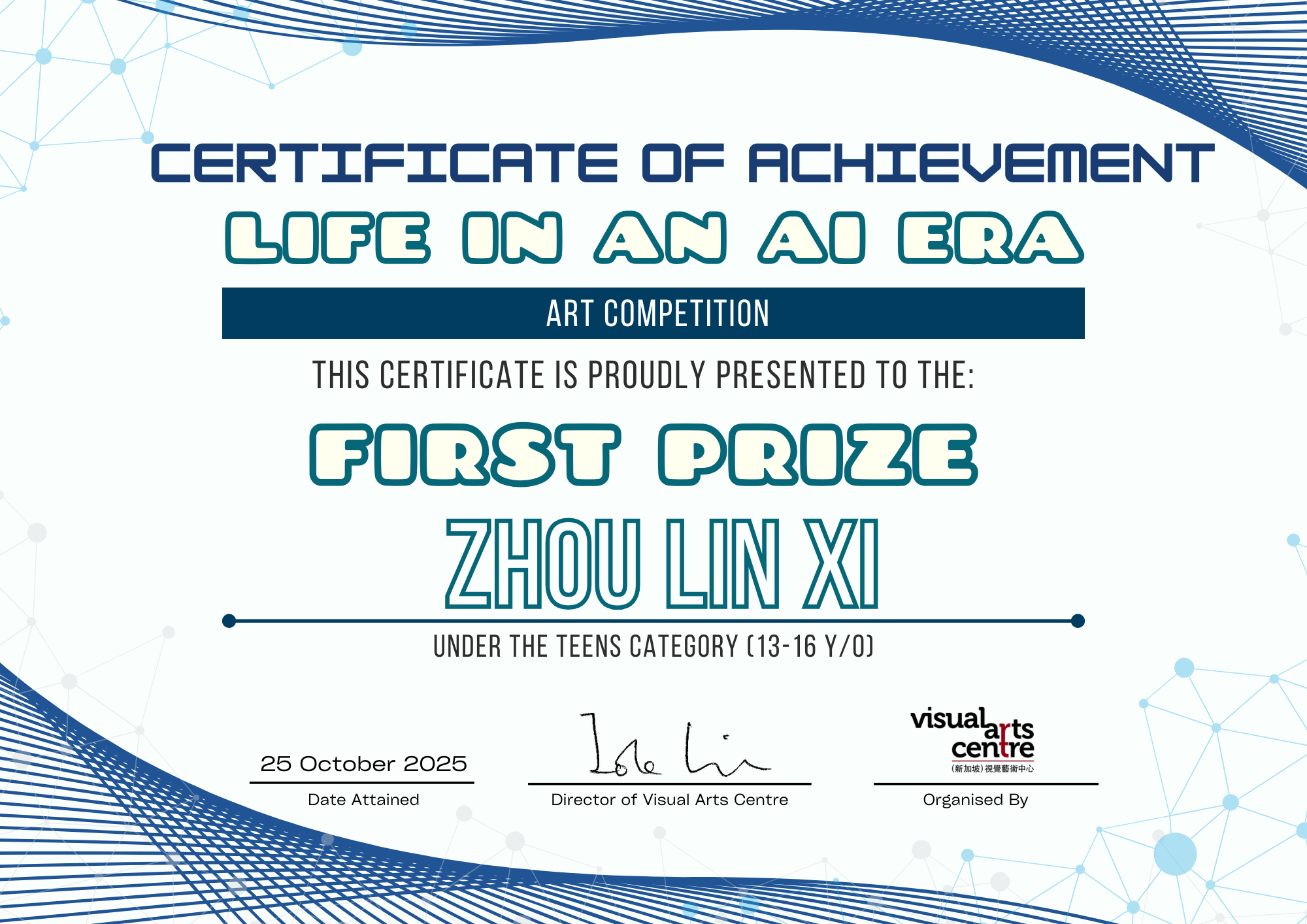 比赛成绩公布日期:2025年10月6日午后12点(成绩将在我们的网站 visualartscentre.sg 公布并电邮通知获奖者)