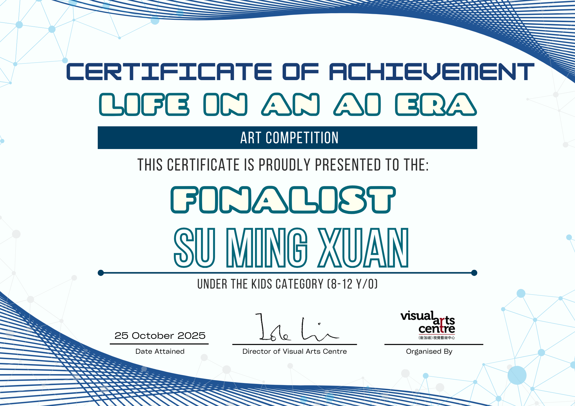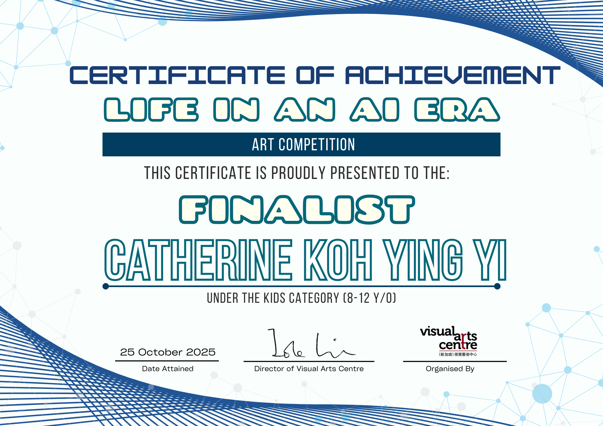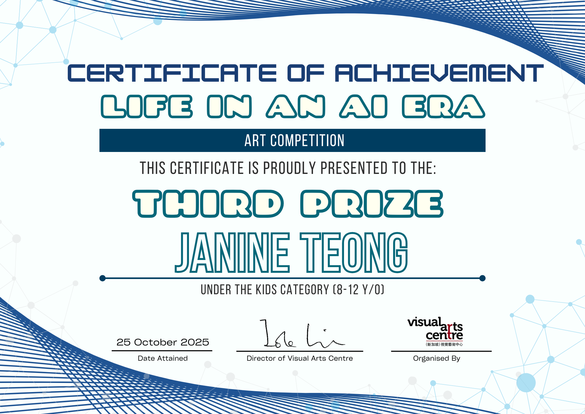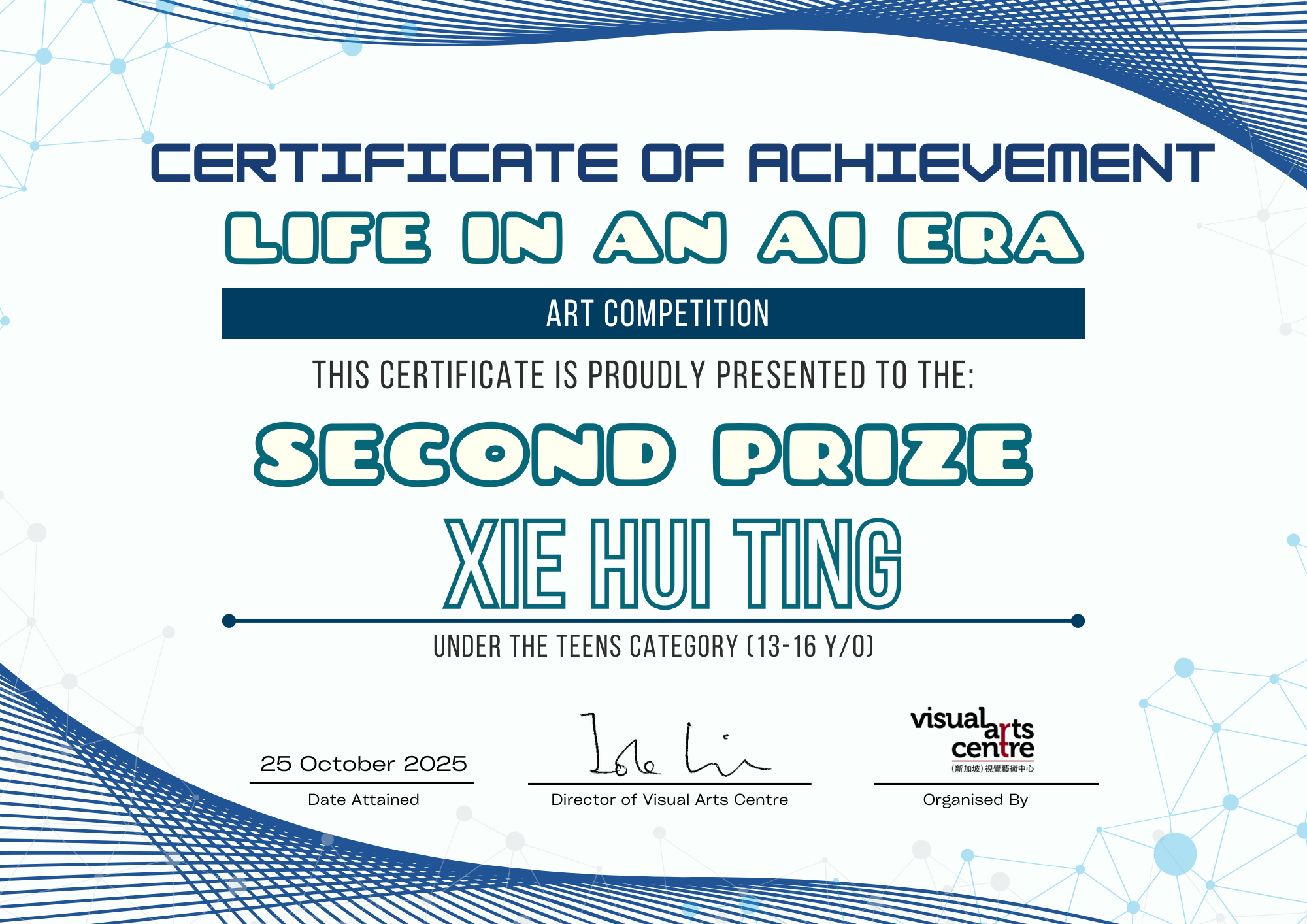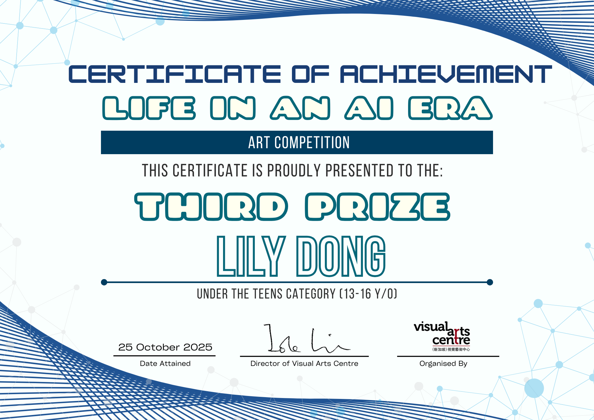 比赛成绩公布日期:2025年10月6日午后12点(成绩将在我们的网站 visualartscentre.sg 公布并电邮通知获奖者)