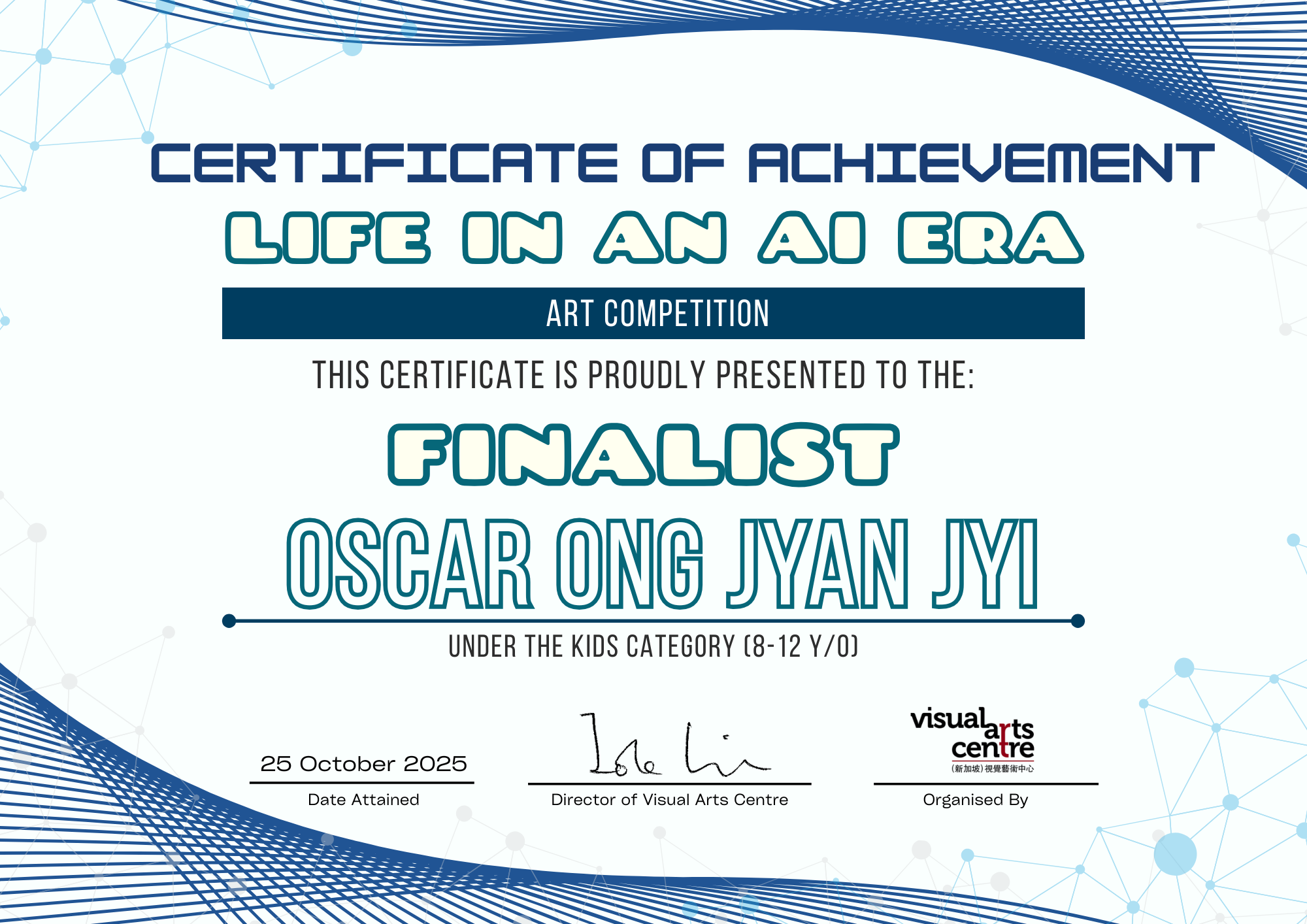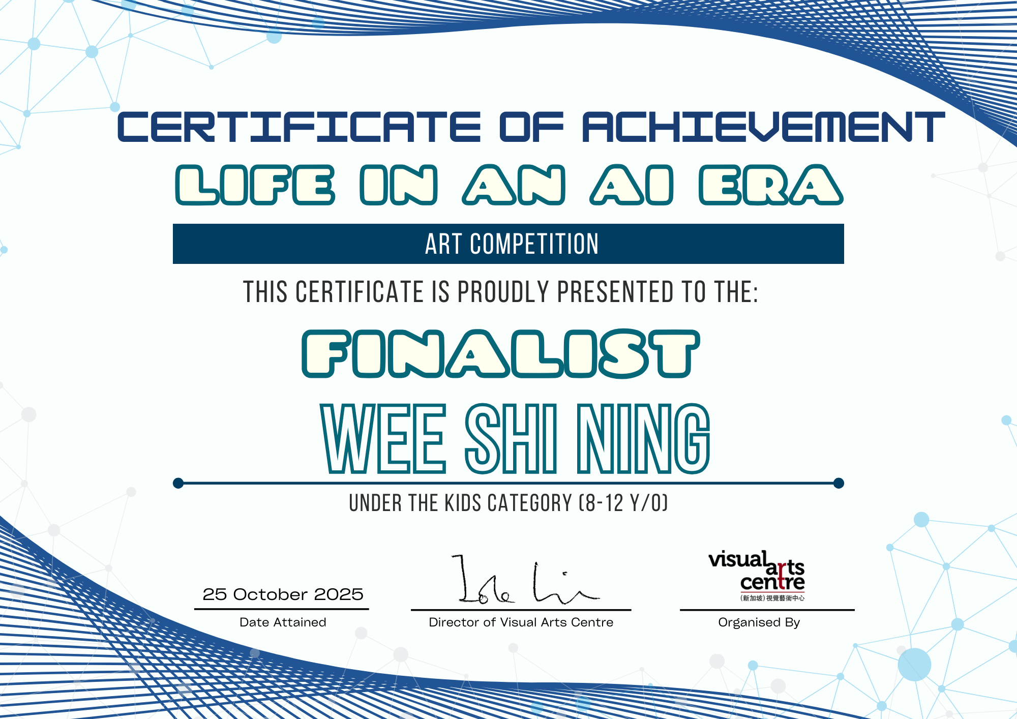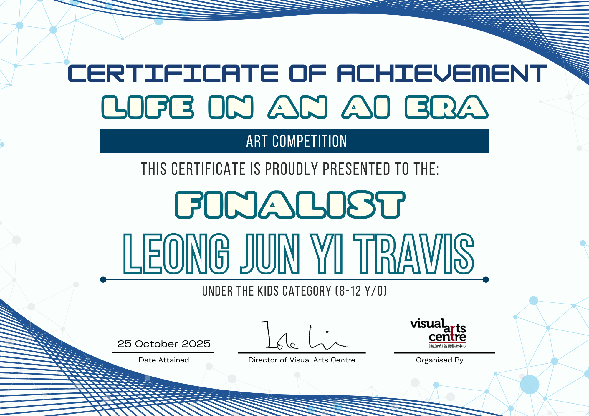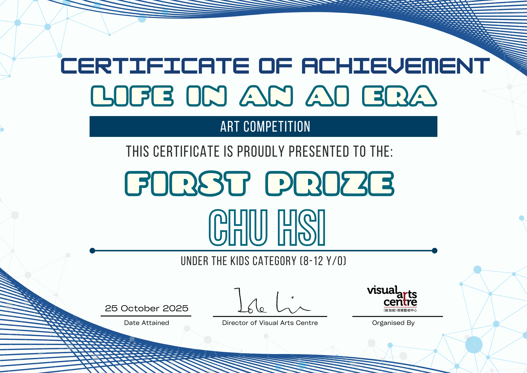 比赛成绩公布日期:2025年10月6日午后12点(成绩将在我们的网站 visualartscentre.sg 公布并电邮通知获奖者)