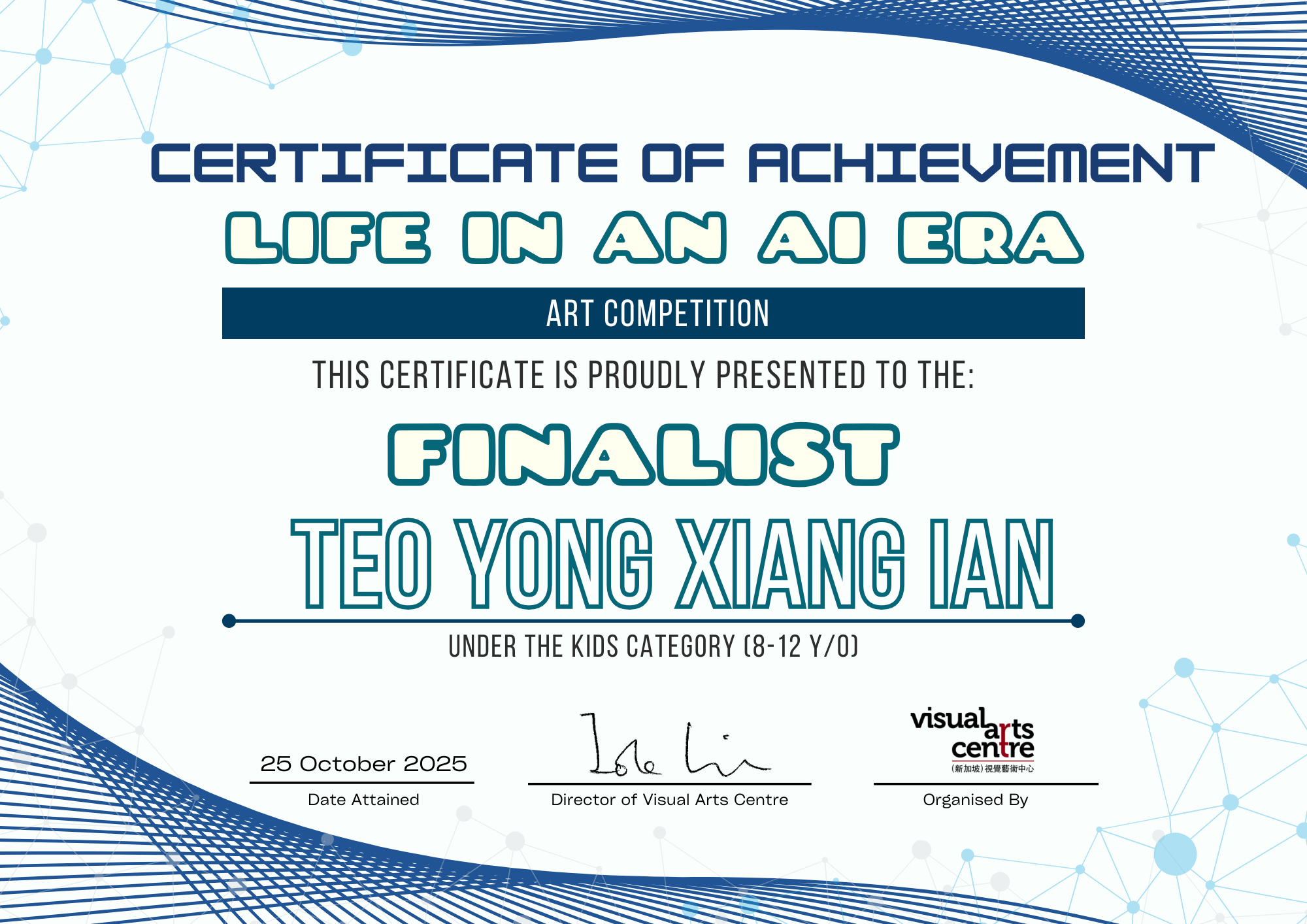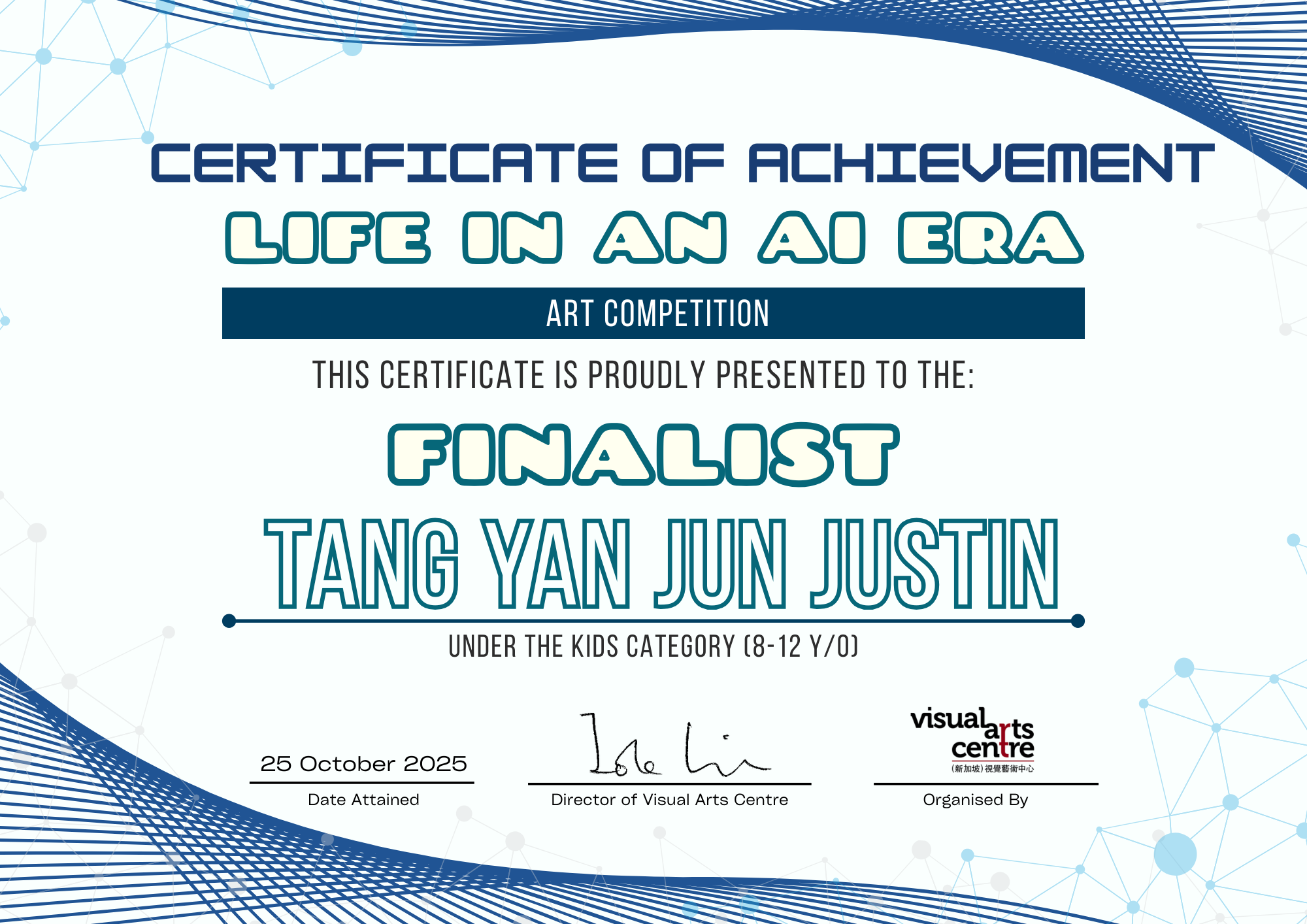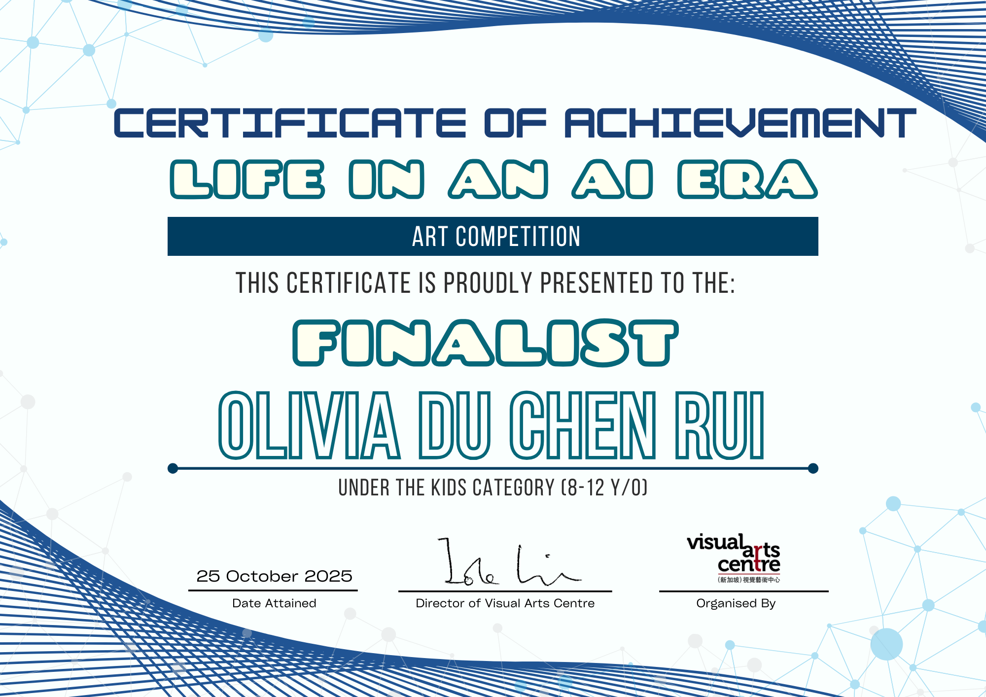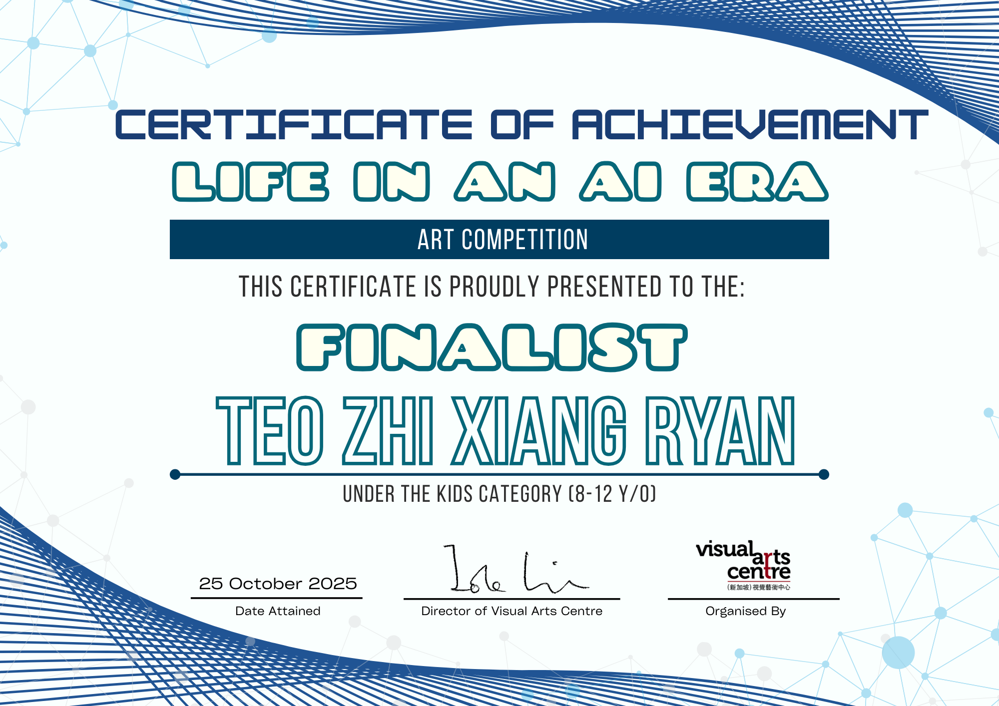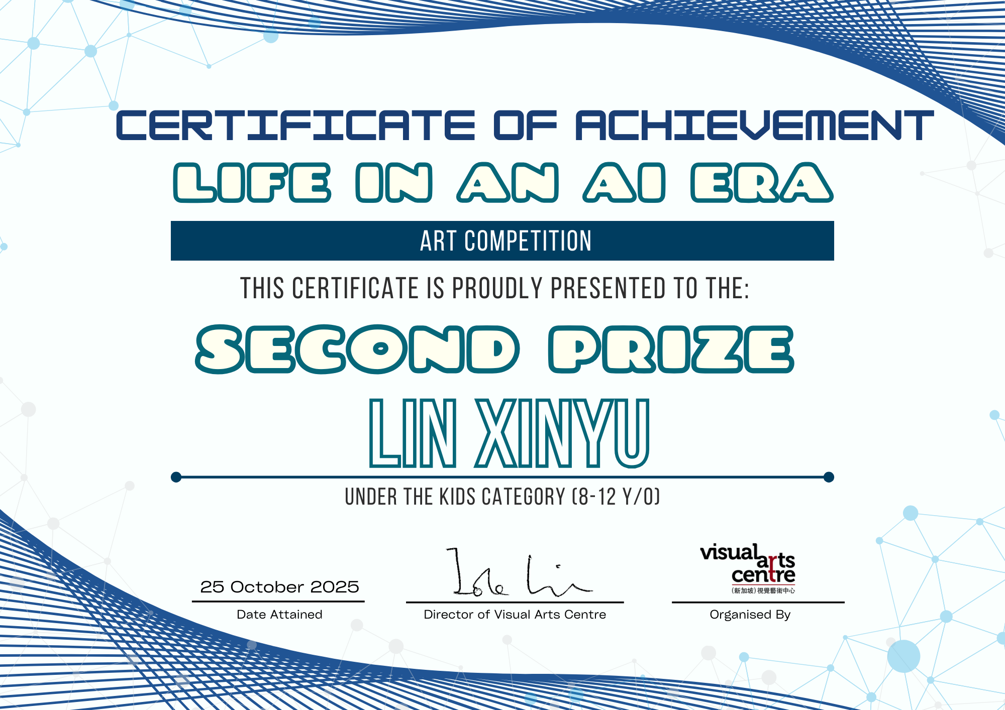 比赛成绩公布日期:2025年10月6日午后12点(成绩将在我们的网站 visualartscentre.sg 公布并电邮通知获奖者)