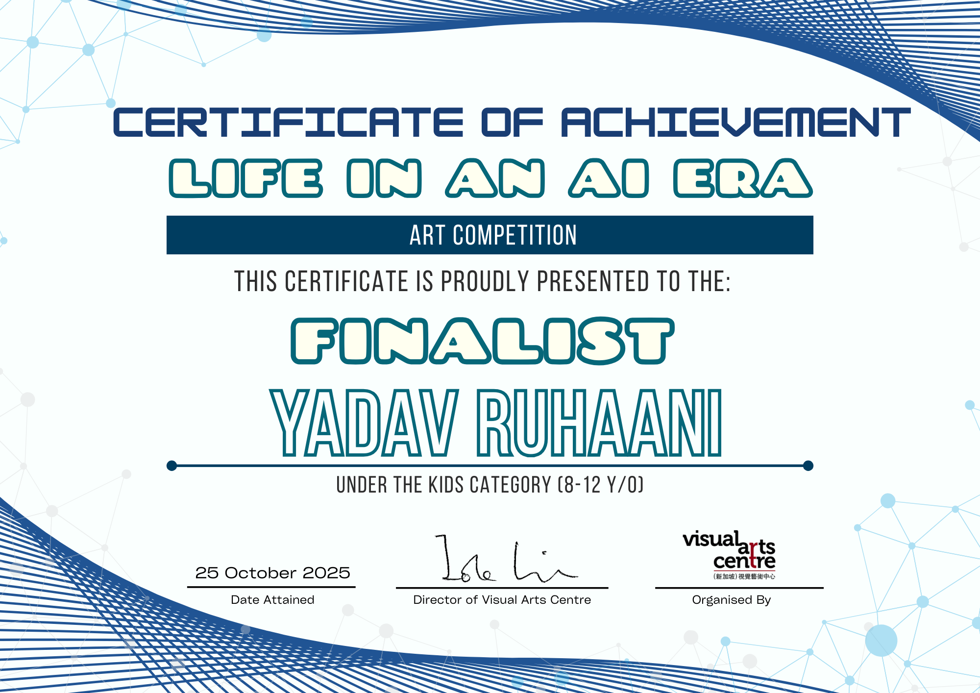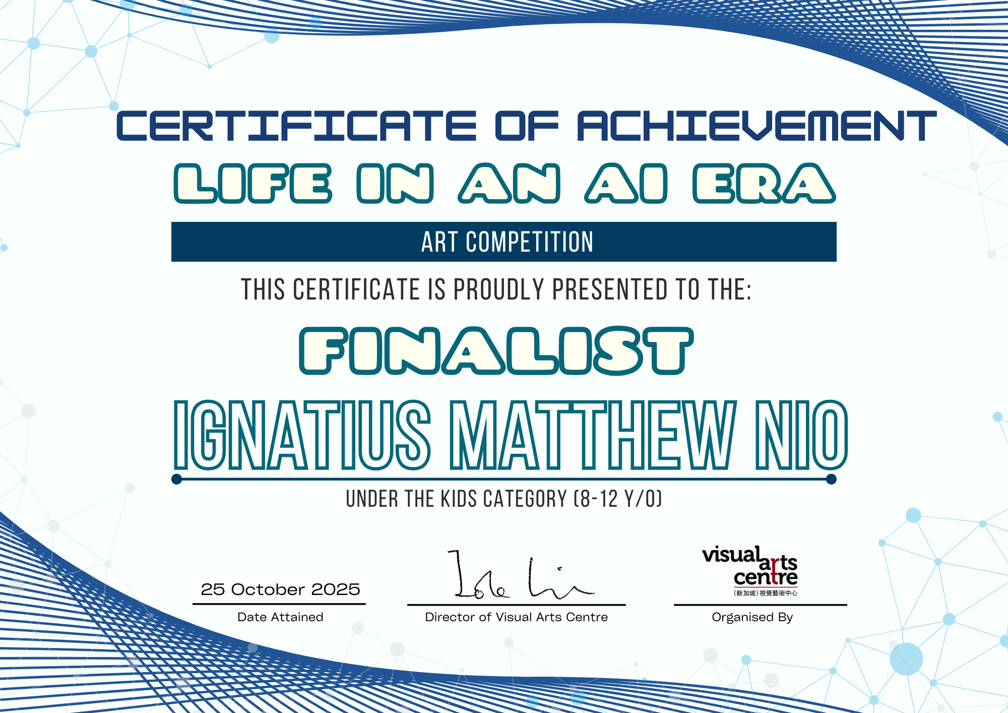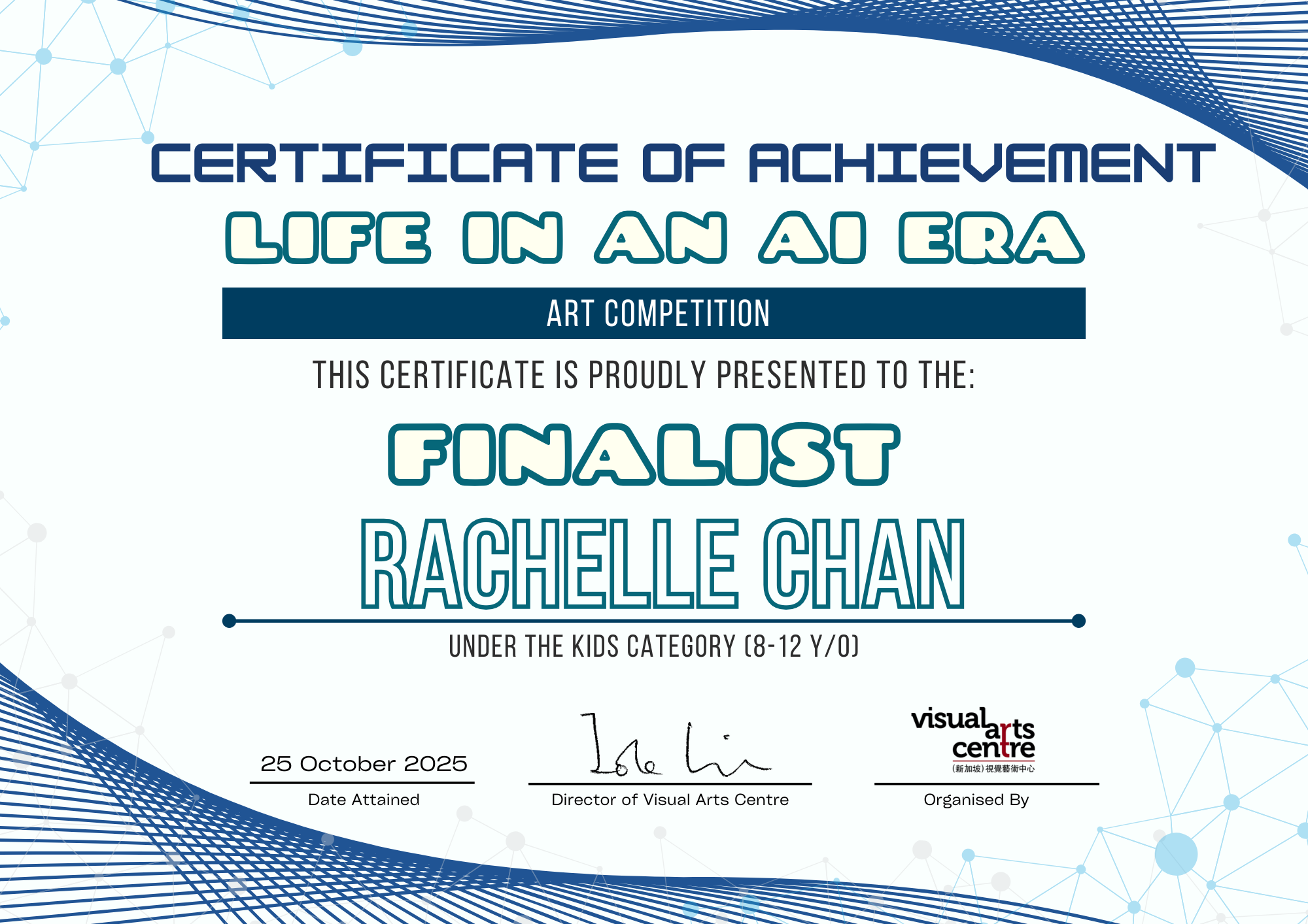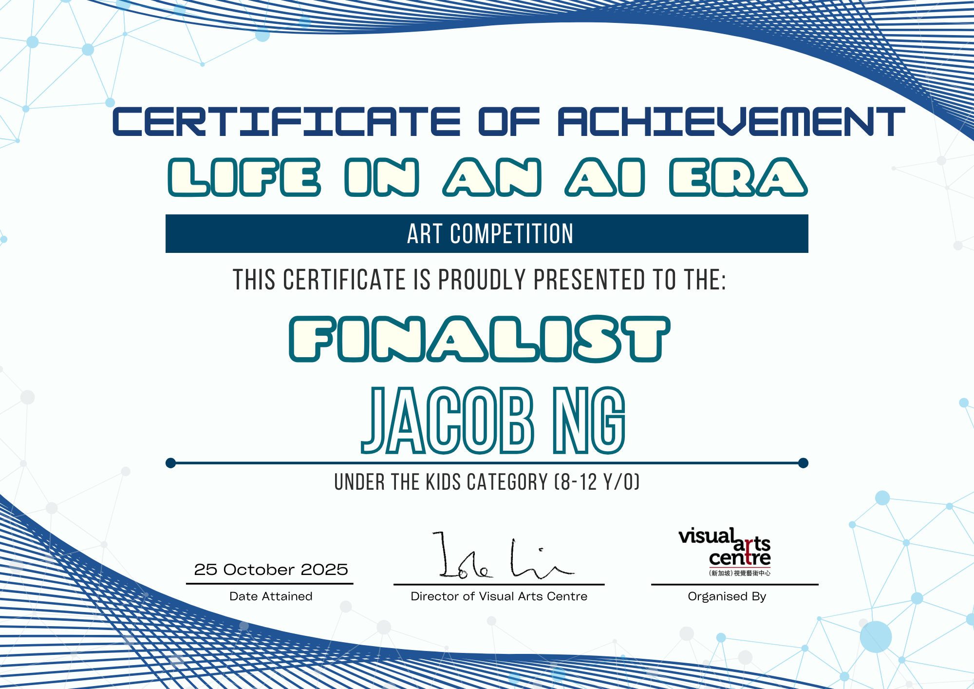 比赛成绩公布日期:2025年10月6日午后12点(成绩将在我们的网站 visualartscentre.sg 公布并电邮通知获奖者)